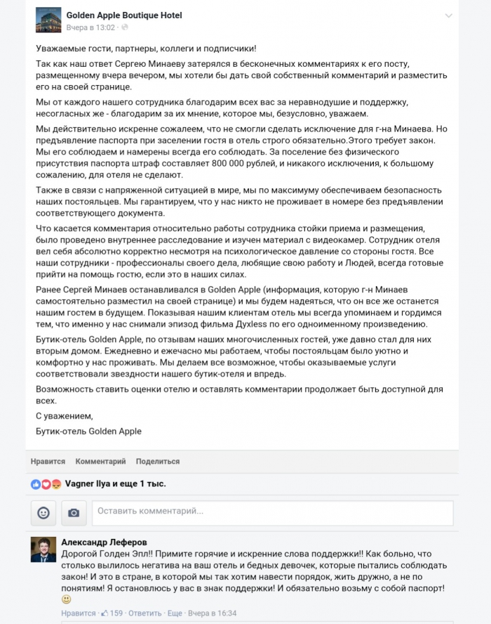 В ответ отель выразил сожаление из-за невозможности «сделать исключение для г-на Минаева». «Предъявление паспорта при заселении гостя в отель строго обязательно. Этого требует закон. Мы его соблюдаем и намерены всегда его соблюдать. За поселение без физического присутствия паспорта штраф составляет 800 000 рублей, и никакого исключения, к большому сожалению, для отеля не сделают. Также в связи с напряженной ситуацией в мире, мы по максимуму обеспечиваем безопасность наших постояльцев. Мы гарантируем, что у нас никто не проживает в номере без предъявления соответствующего документа», — говорится на странице Golden Apple. В отеле гордятся тем, что именно там снимали эпизод фильма «Духless», подчеркнули представители компании.