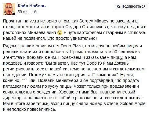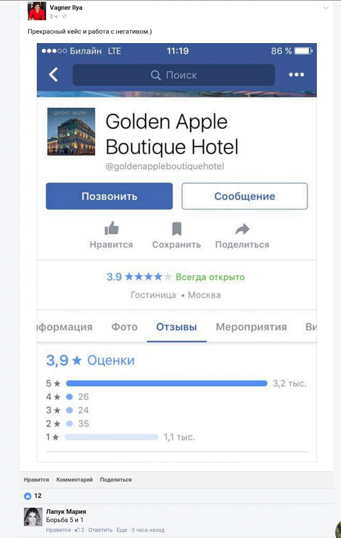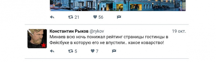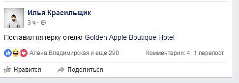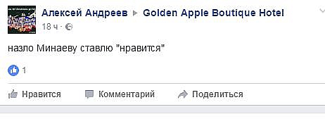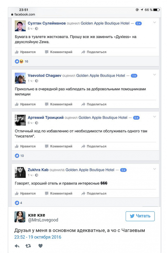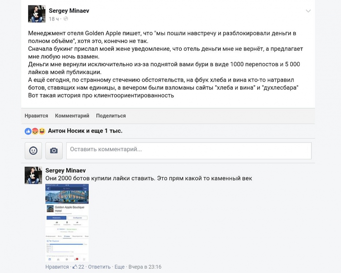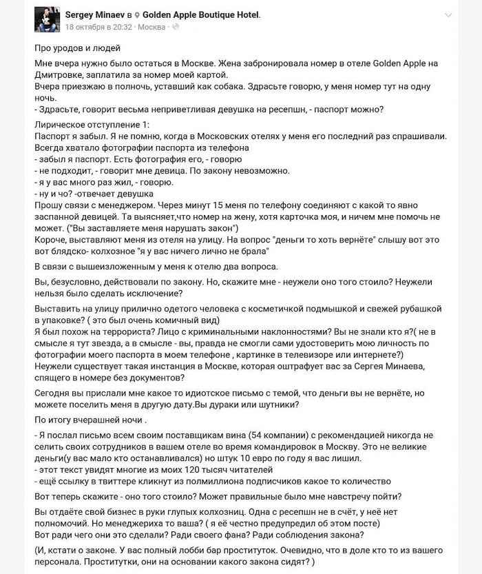 В социальных сетях разгорелся громкий скандал: писатель Сергей Минаев посчитал отель Golden Apple Boutique недостаточно клиентоориентированным и попытался обрушить его рейтинг в Facebook. Причиной стал отказ заселить его в номер. Сотрудница на ресепшн потребовала от постояльца паспорт либо другой документ, удостоверяющий личность. Разговор с менеджером не помог Минаеву, и его «выставили на улицу».
