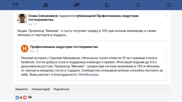 Мнения аудитории разделились. Одни пользователи поддержали Минаева и начали ставить единицы отелю. Рейтинг заведения в Facebook быстро снизился, но вскоре противники писателя исправили ситуацию и попутно раскритиковали поведение Минаева, особенно его склочность.