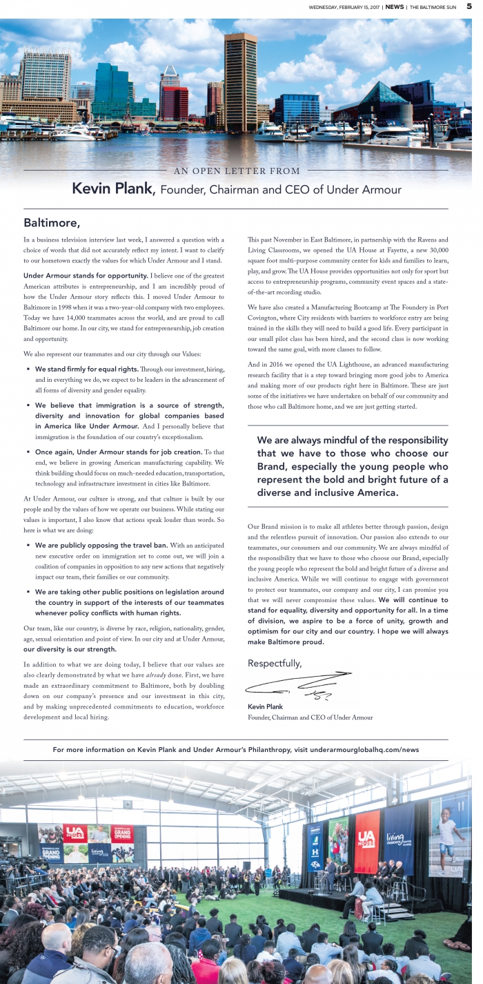 Получив множество гневных откликов, бизнесмен решил объясниться перед общественностью. Для этого он выкупил полосу в газете The Baltimore Sun, где разместил открытое письмо. Планк напомнил, что перенес штаб-квартиру в Балтимор через два года после создания компании, когда там работало всего два человека. Все это время Under Armour выступала за равные права и создавала рабочие места. По его словам, в команде трудятся люди разных национальностей, возрастов, с разными взглядами и разной сексуальной ориентацией. Компания Under Armour уверена, что ее сила заключается именно в разнообразии, а иммиграция — источник инноваций для глобального бизнеса, базирующегося в Америке.