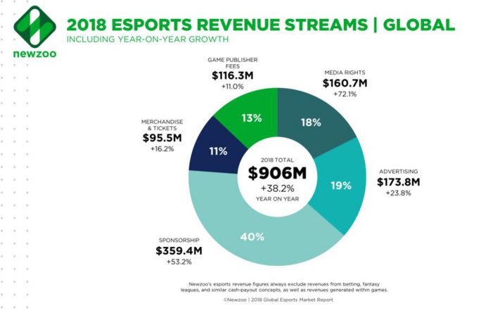 Общая выручка компаний, работающих в сфере киберспорта, по итогам 2018 года вырастет в мире на 38,2%, до 905,6 миллиона долларов. Данные по выручке включают в себя спонсорство, рекламу, билеты и мерчандайзинг и не учитывают суммы призовых фондов и зарплаты игроков, а также доходы от онлайн-игр и ставок.