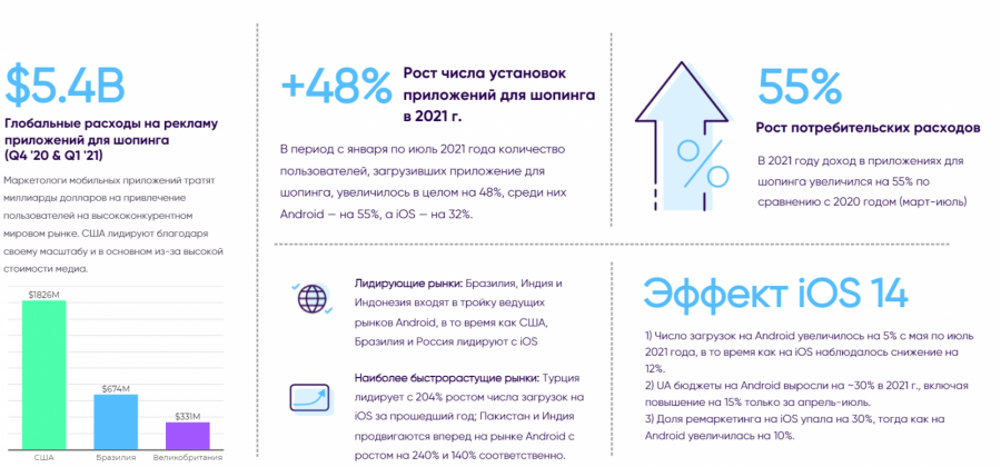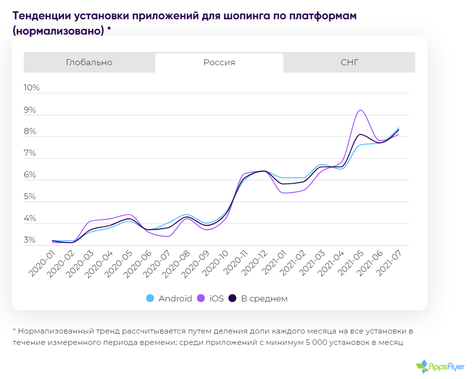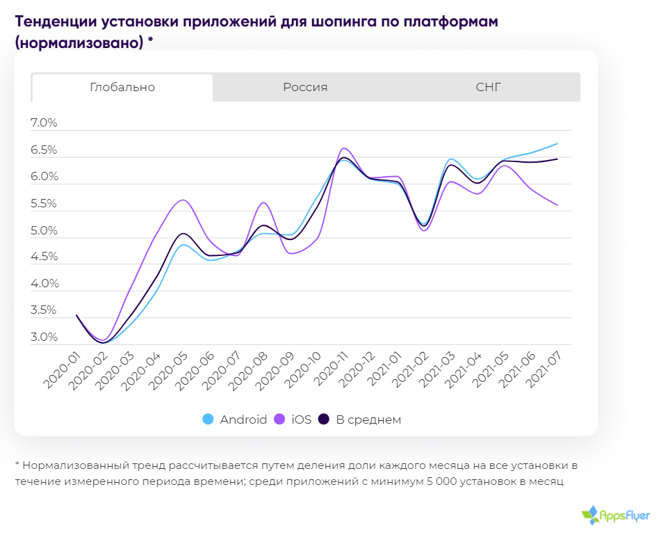 В период с января по июль 2021 года количество пользователей, загрузивших приложение для шопинга, увеличилось в целом на 48%, среди них Android — на 55%, а iOS — на 32%. В России в первое полугодие 2021 года рост составил 92%. Так, количество установок приложений уже увеличилось на 38% на Android и на 56% на iOS, в то время как потребительские расходы в целом выросли на 71%.