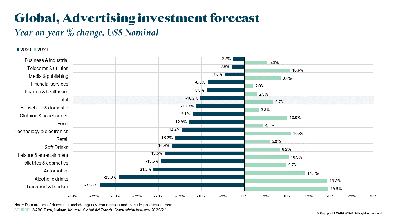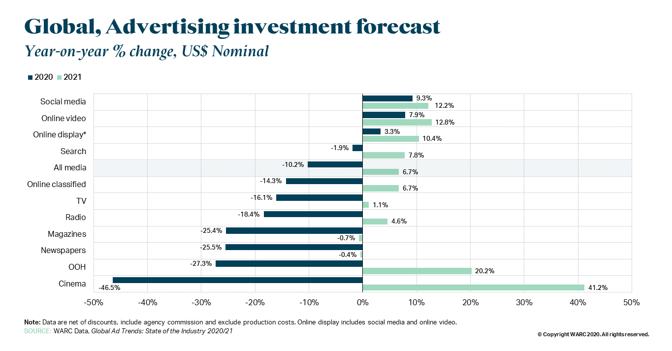 WARC представил прогноз по глобальному рекламному рынку на 2020−2021 годы. Это был самый сложный год для индустрии за 40 лет мониторинга, пишут авторы исследования. Один из исследователей, Джеймс Макдональд, отмечает: «Некоторые платформы, такие как электронная коммерция и социальные объекты, вышли из кризиса относительно невредимыми, но большая часть медиа ощутила значительный ущерб».