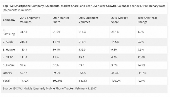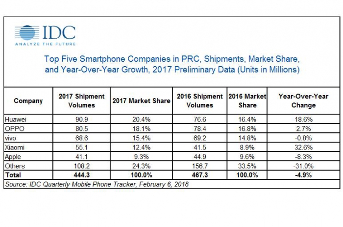 Однако крупные игроки рынка укрепили свои позиции. В частности, лидером рынка смартфонов в Китае в прошлом году стала Huawei, поставки которой достигли 90,9 млн устройств, а доля рынка выросла до 20,4% с 16,4% в 2016 году. На втором месте — Oppo, доля которой повысилась с 16,8% до 18,1%, на 3-м — Vivo, на 4-м — Xiaomi. Apple замыкает топ-5 с долей рынка 9,3%.