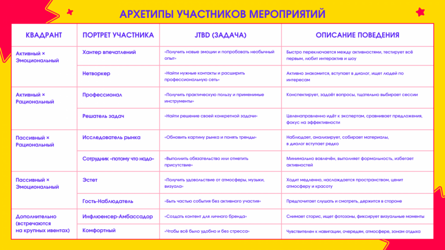 У каждого архетипа своя мотивация и логика принятия решений: один приходит за эмоциями, другой — за структурированными знаниями. И если заранее понимать, кто именно придет, можно продумать мероприятие так, чтобы все сегменты получили ценный для себя опыт.