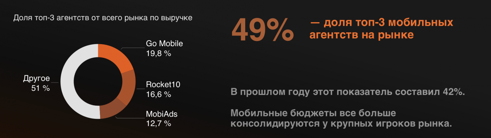 Доля топ-3 мобильных агентств на рынке составляет 49%. В прошлом году этот показатель равнялся 42%. Это свидетельствует о большей консолидации мобильных бюджетов у крупных игроков рынка.