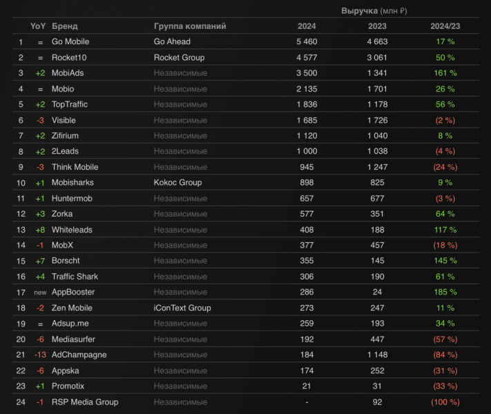 Rocket10 (4,5 млрд руб.), третье — MobiAds (3,5 млрд), который сместил Visible с третьей на шестую позицию по итогам 2024 года.