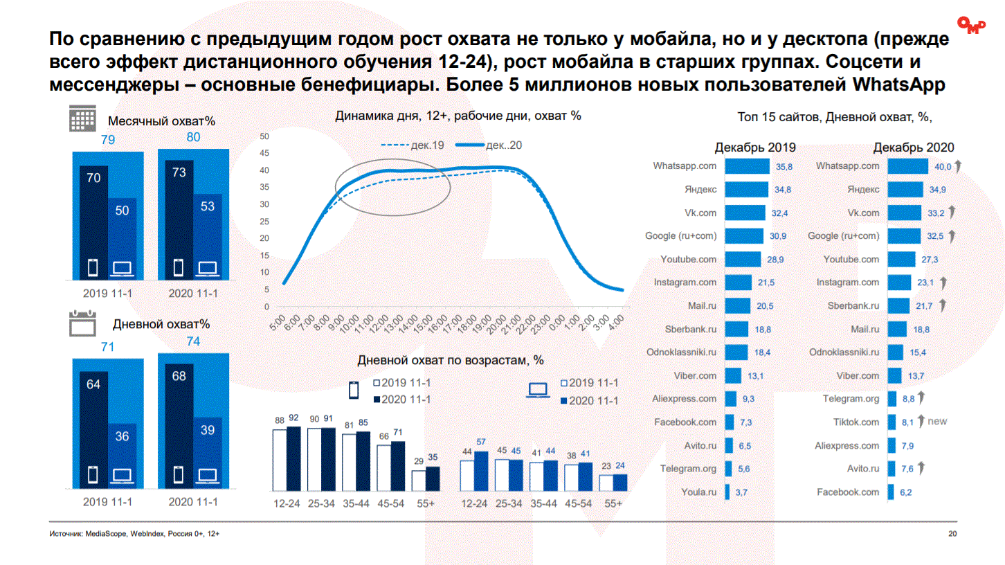 В феврале мы продолжаем наблюдать увеличение охвата всех медиа в дневное время: в определенные часы рост достигает 1,5 процентных пункта на ТВ и 3,5 п.п. в онлайне. Также заметно восстановление дневного охвата десктопа, плавно снижавшегося в предыдущие годы — 39% против 36% в начале 2020 года. Это произошло за счет перехода школьников и студентов на дистанционный формат обучения.