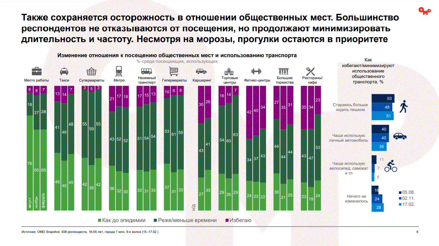Уже в августе 2020 года покупатели вернулись в торговые помещения, но до сих пор лишь около половины из них проводят там столько же времени, сколько до пандемии. Короткие целевые визиты — новая устойчивая привычка. В декабре, например, главной причиной посещения ТЦ стала покупка новогоднего подарка, заранее выбранного в интернете — так ответили 37% респондентов.