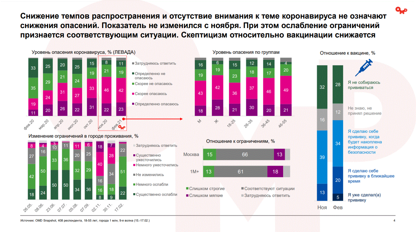 Тем не менее это не приводит к выраженному снижению уровня опасений. Население продолжает соблюдать меры предосторожности, минимизировать посещение общественных мест и носить индивидуальные средства защиты. Фоновая тревожность стала привычкой. Маски и санитайзеры не собираются исключать из своей жизни более половины респондентов даже после окончания пандемии, например, во время вспышек сезонного гриппа.