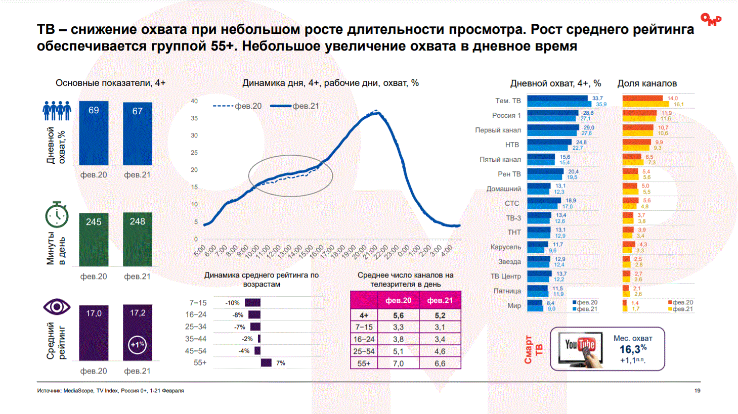 - Падение ТВ — более выражено в группах моложе 55 лет;