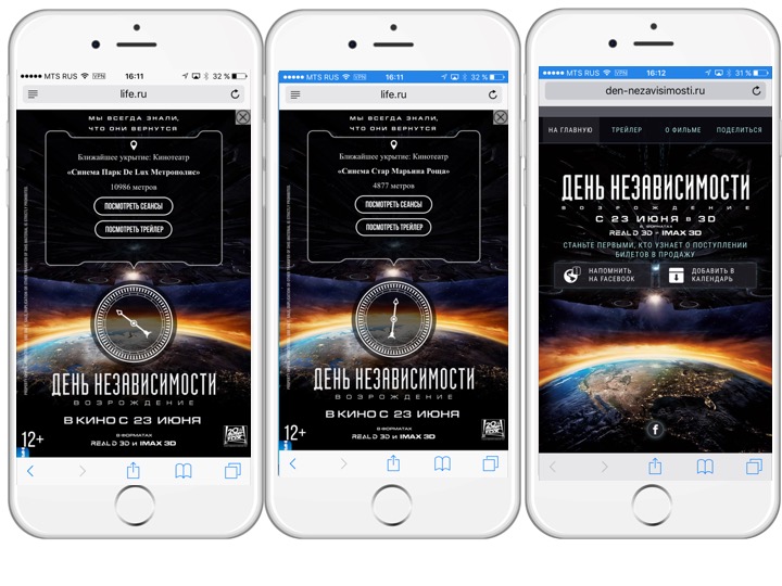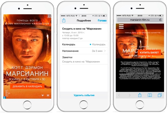 В рамках общего продвижения фильма «Марсианин» в сети iVengo Mobile была запущена рекламная кампания, приуроченная к старту показов в кинотеатрах России. На площадках сети был запущен полноэкранный статичный баннер с афишей фильма, а также кнопкой «Добавить в календарь». В данном случае была реализована функция привязки баннера к установленному по умолчанию в мобильное устройство календарю, которая позволяла автоматически занести напоминание о премьере фильма.