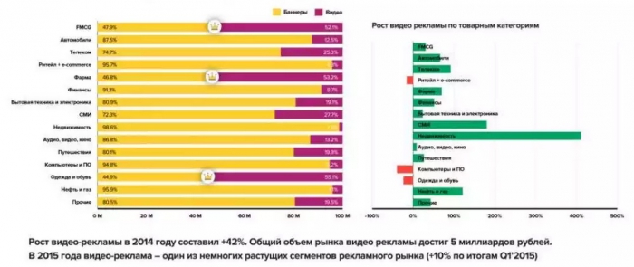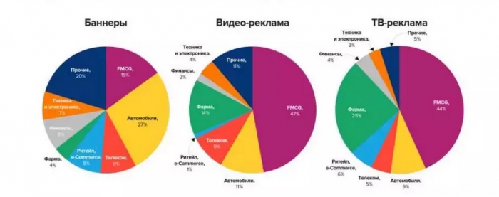 В дисплейной рекламе можно уверенно говорить о наступлении видео, на которое приходится 26,2% сегмента. Самыми динамичными категориями в плане освоения видеорекламы являются Недвижимость и СМИ. При этом у FMCG, Фармы и Одежды/обуви доля видео превышает 50% расходов. Баннерную рекламу выбирают рекламодатели, которые мало присутствуют на ТВ и ориентируются на performanсe метрики.