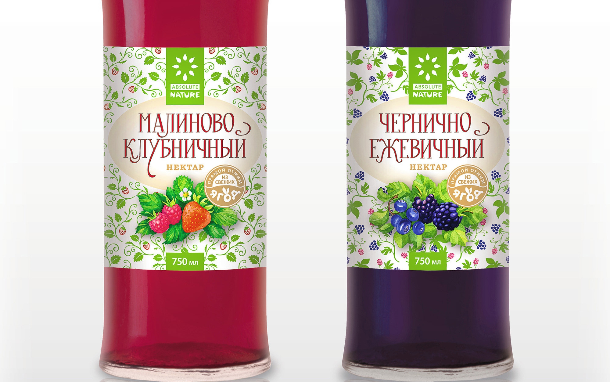 По заказу компании «Живые соки» брендинговое агентство Golden Marrow осуществило рестайлинг визуального образа линии премиальных нектаров прямого отжима под брендом «Absolute Nature».