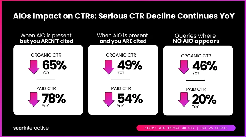 Запросы без AI-обзоров потеряли 41% органического CTR, что говорит о более широком изменении поискового поведения пользователей.