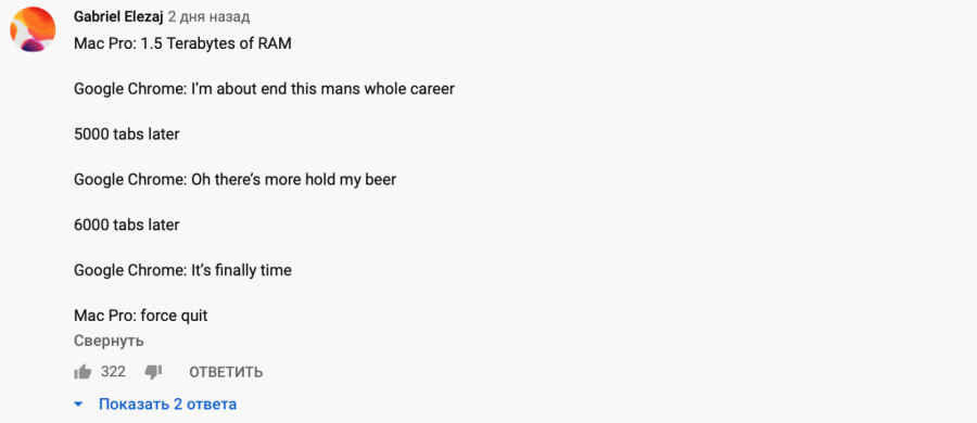 Блогер Джонатан Моррисон решил проверить, можно ли замедлить такой мощный компьютер. Для этого он столкнул в битве Mac Pro с Google Chrome. Браузер известен как «пожиратель» оперативный памяти, из-за чего не раз становился героем мемов.