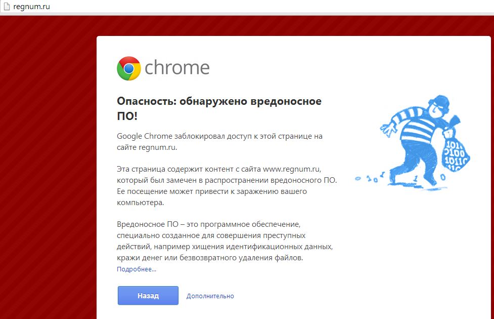 Браузер Google Chrome перекрыл доступ к очередному информационному агентству. На этот раз распространение вредоносного софта было замечено на сайте REGNUM.ru.