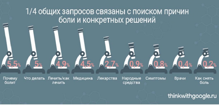 Исследования выявили, что 75% запросов в этой категории исследуют причины и виды боли. Только 25% общих запросов сформулированы конкретно и касаются определенных лекарственных препаратов. И всего 0,9% запросов для поиска народных средств в качестве решения проблемы избавления от боли.