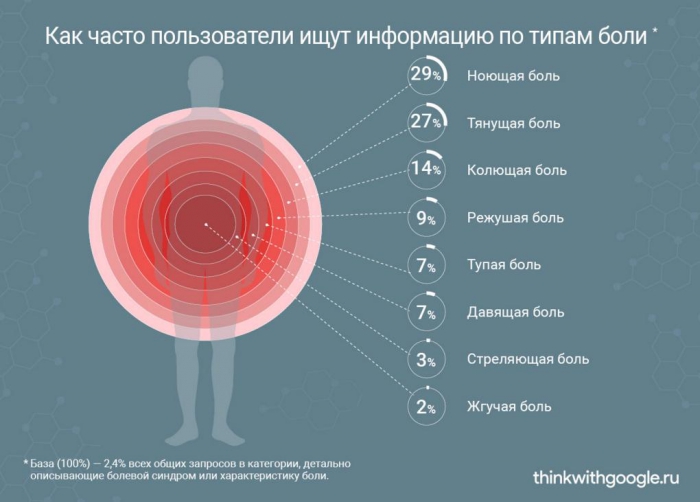 В последнее время интерес россиян к поиску в интернете причин боли и способов с ней справиться постоянно растет. В 2016 году число запросов, связанных с болью, достигло 27 миллионов. Среди наиболее распространенных жалоб — боль внизу живота, в боку, в пояснице, в горле, в груди и в желудке.