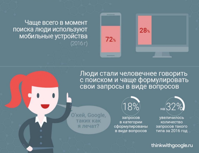 В последнее время меняются подходы к поиску информации в категории «Боль». Преимущественно в момент поиска люди используют мобильные устройства: в 2016 году 72% запросов пришлось на смартфоны. Люди стали чаще говорить с поиском и формулировать свои запросы в виде вопросов.