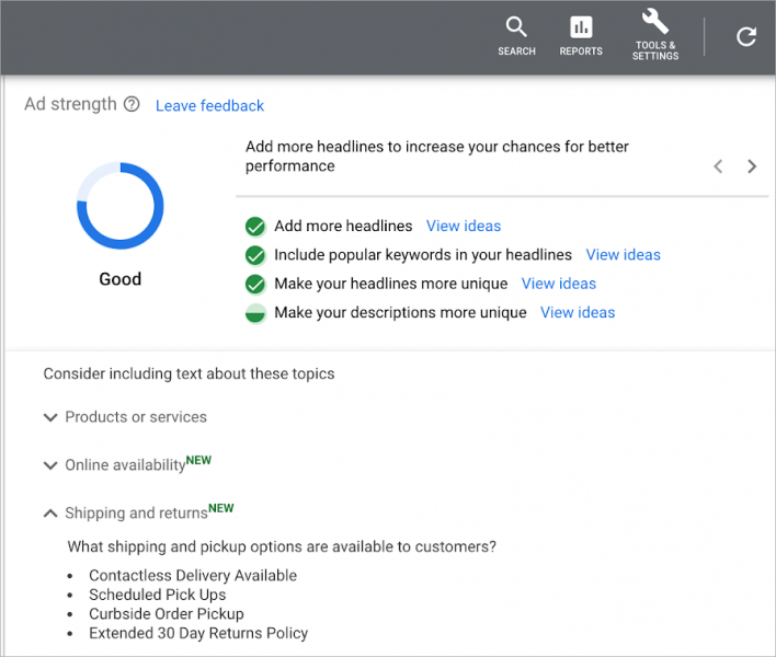Еще одно обновление от Google — улучшенные предложения для рекламодателей на этапе написания заголовков и текстов объявлений. При размещении рекламы появятся новые категории, которые рекомендуют часто используемые фразы и помогут подчеркнуть, что компания доступна онлайн, а также шаблоны для информации о доставке и возвратах. Это сделает объявления более информативными, считают разработчики.