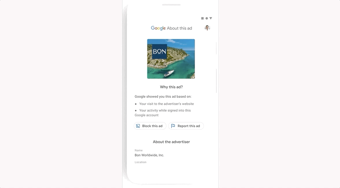 Новая кнопка «Об этом объявлении» (About this ad) будет доступна в любой рекламе. С помощью нее пользователи увидят название и расположение того, кто запустил кампанию. Сначала ее протестируют на медийных объявлениях, оформленных через Google Ads и Display & Video 360. В другие платформы ее добавят в 2021 году.