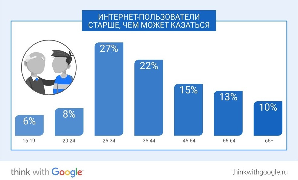 Аудитория Рунета старше, чем может показаться: ежедневно выходят в сеть 13% россиян в возрасте 55−64 лет и 6% пользователей в возрасте 16−19 лет. Разрыв между категориями 20−24 и 65+ менее заметен: 8% против 10%. Таковы данные Google и Kantar TNS, которые провели исследование и выделили несколько ключевых трендов в поведении российской интернет-аудитории.