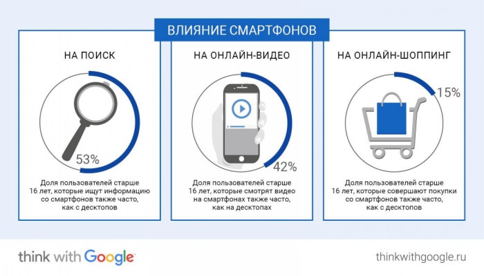 Естественно, что представители различных возрастных групп по-разному ведут себя в сети. Так, пользователи 16−24 лет активнее других участвуют в создании онлайн-контента, а аудитория 25−34 чаще выходит в интернет для поиска информации и развлечения. Более половины (53%) пользователей старше 16 лет ищут информацию со смартфонов так же часто, как с десктопов.