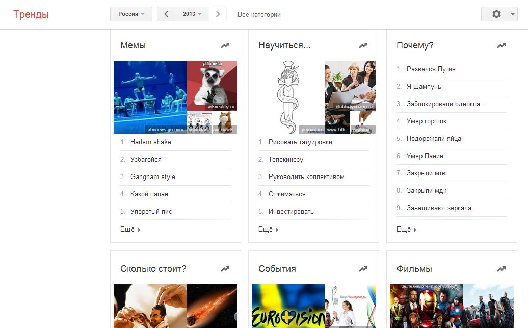 Среди мемов наибольший прирост поисковых запросов продемонстрировали Harlem Shake, «Узбагойся», Gangnam Style, «Какой пацан» и «упоротый лис». Вопрос «почему?» россиян интересовал в связи с разводом Путина, шампунем [почему я шампунь], блокировкой на «Одноклассниках», смертью Горшка (лидера музыкальной группы «Король и шут»).