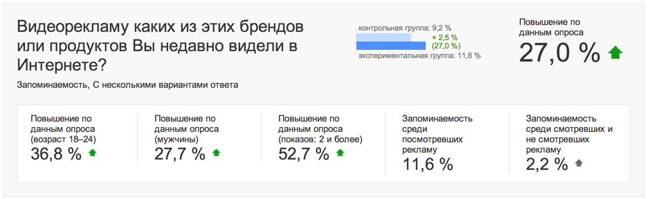 Статистика в отчете собирается на основе сравнения показателей 2 групп пользователей - тех, кто просмотрел рекламное видео, и тех, кому он не был показан (в скриншоте ниже проценты отражают разницу в ответах именно между этими двумя группами):