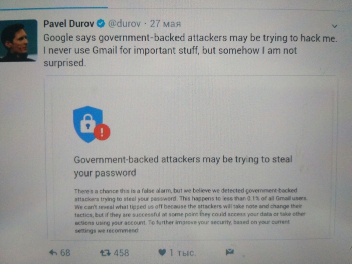 “Google считает, что проправительственные хакеры пытаются взломать меня. Я не использую Gmail для важных вещей, но почему-то я не удивлен”, - написал Дуров.