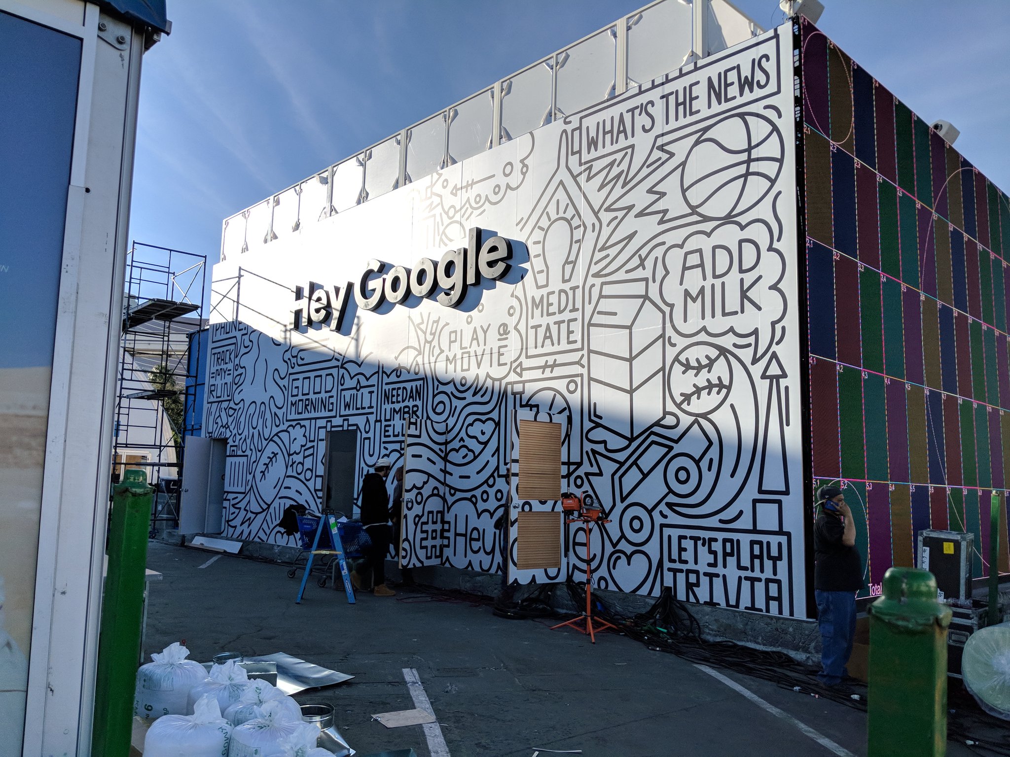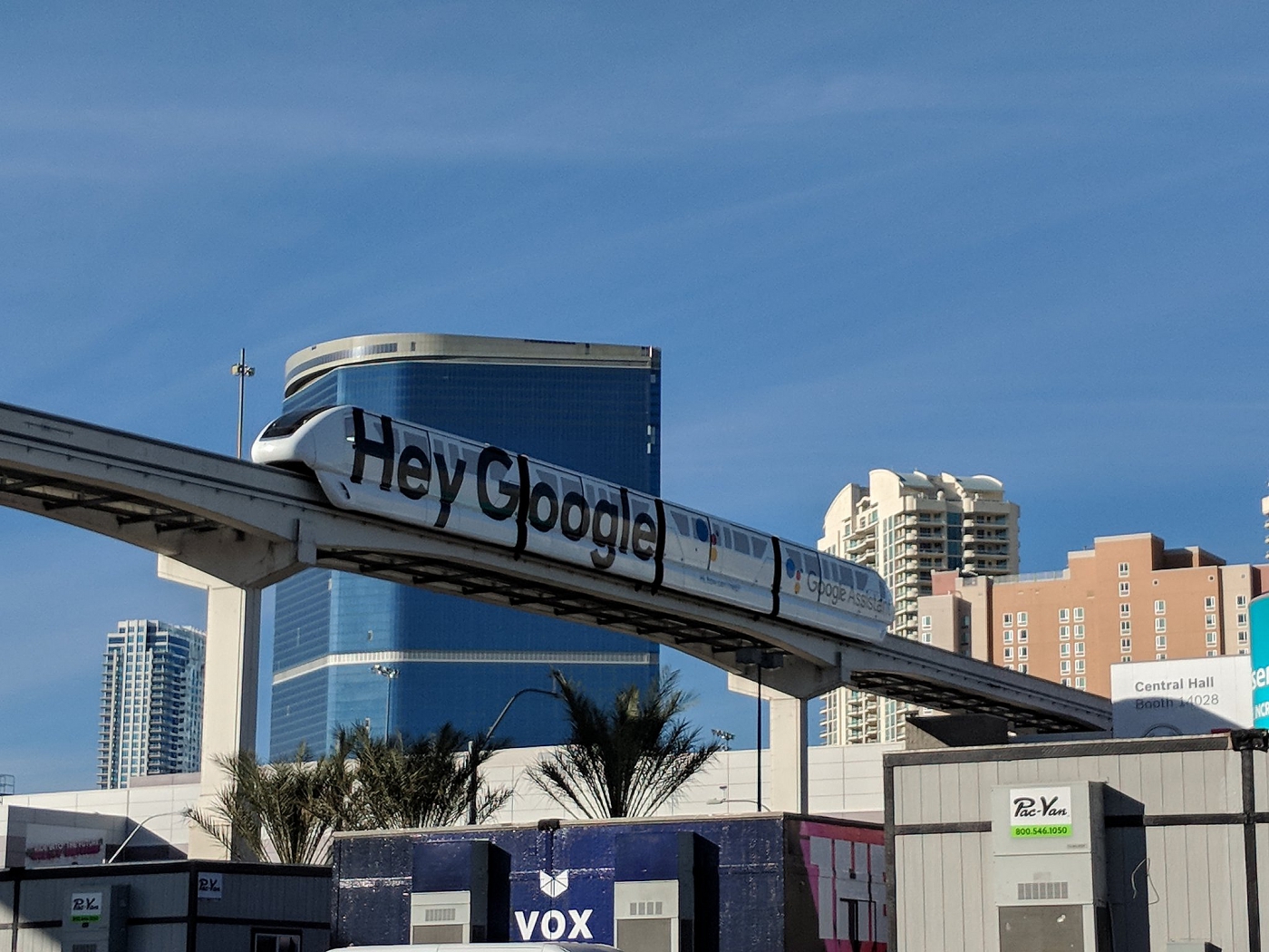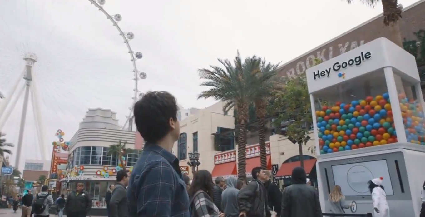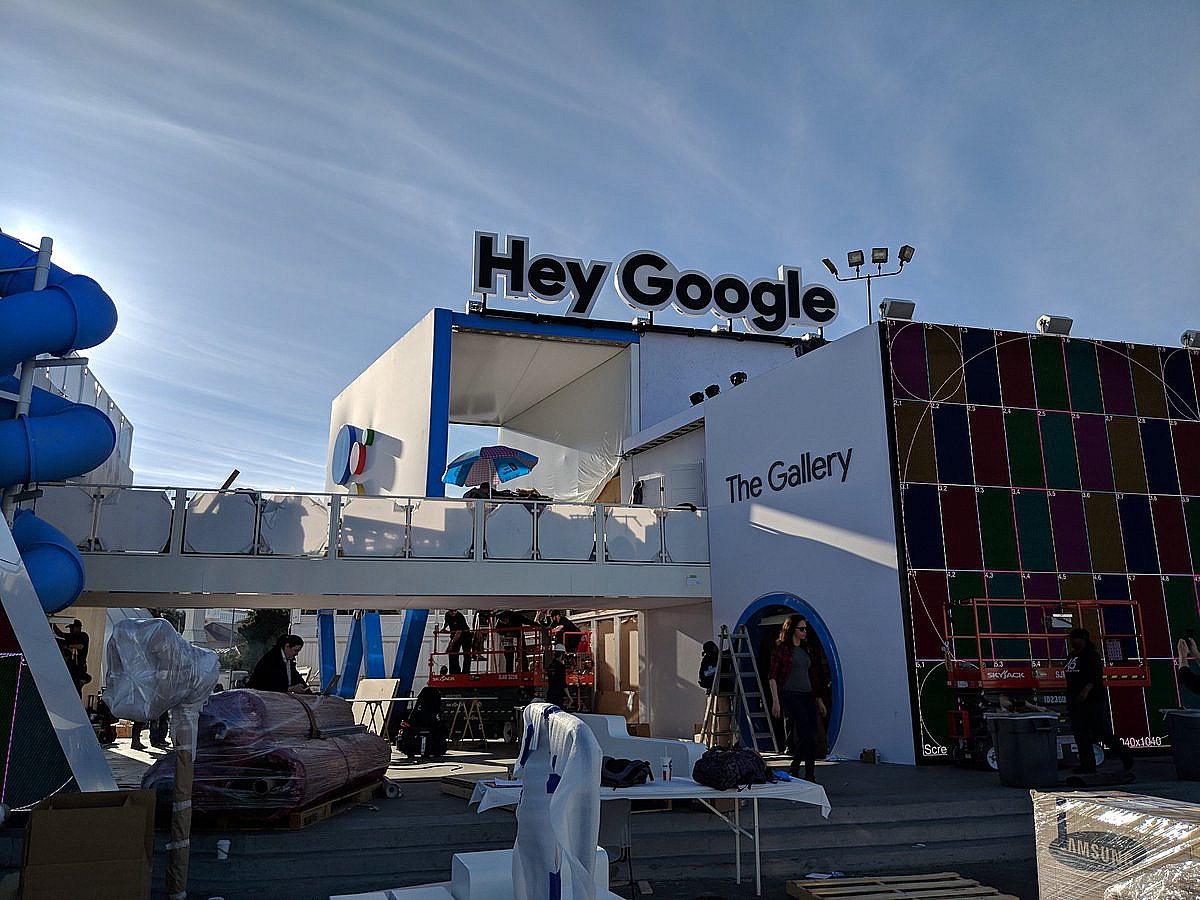 Жители и гости Лас-Вегаса заметили приготовления Google задолго до открытия выставки. Сначала над причудливым павильоном, повторяющим принт на приглашении Google, появилась конструкция Hey Google. Потом компания забрендировала два монорельсовых поезда. Вскоре, свидетельствует Techcrunch, Google был везде. Его присутствие было заметно еще на подъезде к конгресс-центру Лас-Вегаса, где проходила выставка.