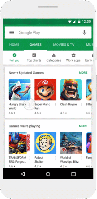 Во-первых, в ближайшие месяцы Google запустит новые рекламные видеоформаты, работающие по модели click to play. Это играбельная реклама (playable ad) и многоопциональная видеореклама (multiple-option video ad). Они будут размещаться в Google Play и позволят пользователю попробовать игру без установки приложения. Форматы поддерживают изображение, звук и анимацию. Оценить их смогут разработчики, работающие с AdMob.