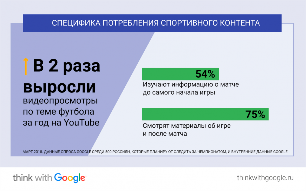 Во время спортивных мероприятий растет и онлайн-вовлеченность пользователей. Как показывают данные Google, количество репостов и комментариев к футбольным видео в России увеличивается в три раза во время четырехнедельного чемпионата по сравнению с другими периодами. При этом 90% спортивных фанатов во время просмотра игр используют мобильные устройства. Во время рекламных пауз крупных ТВ-шоу и футбольных матчей пользоваться смартфонами и планшетами начинают еще активнее, поскольку люди ищут в сети релевантный контент и делятся впечатлениями в соцсетях.