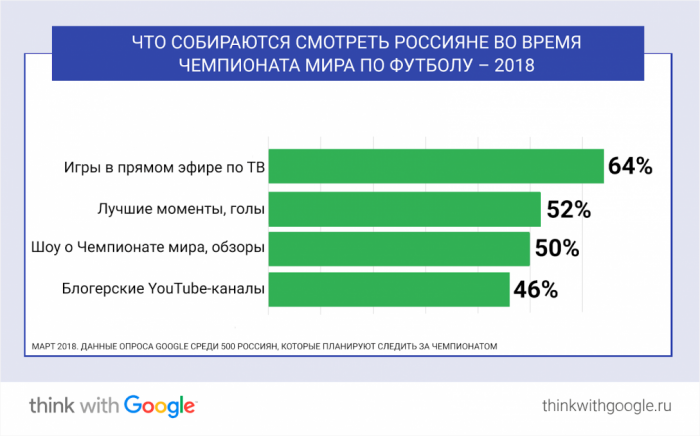 Как показали результаты опроса Google, 75% респондентов планируют следить за новостями о Чемпионате мира хотя бы раз в день, при этом 31% опрошенных собираются делать это на YouTube.