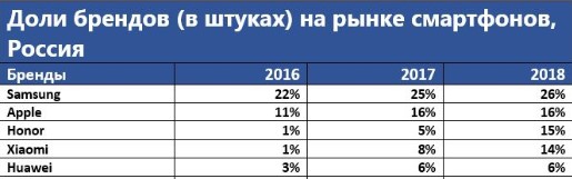 В России, по данным портала tadviser, очень хорошо продаются смартфоны бренда Honor, принадлежащий Huawei. В 2018 году он вышел на третье место по продажам с 15% после Samsung (26%) и Apple (16%) и составляет три четверти продаж китайской компании в стране. Сам Huawei в этом же списке на 5 месте (6%).