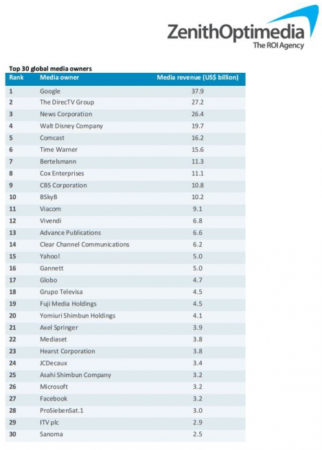 Поисковый гигант Google обошел последнего конкурента и возглавил рейтинг Top Thirty Global Media Owners. Его медиавыручка на 39% превысила доходы телекомпании DirecTV, которая ранее занимала первое место. Список крупнейших медиакомпаний представлен агентством ZenithOptimedia.