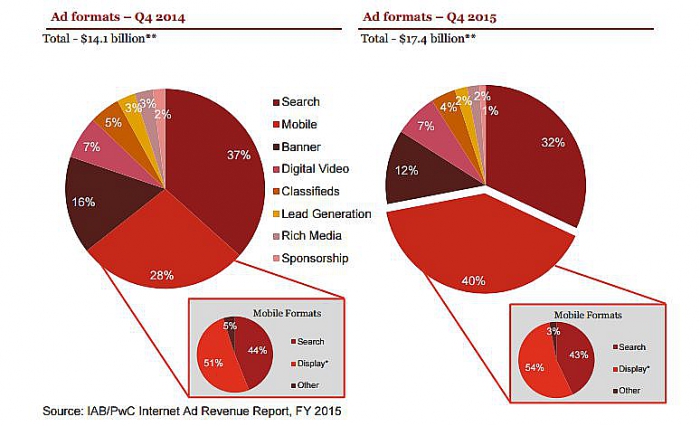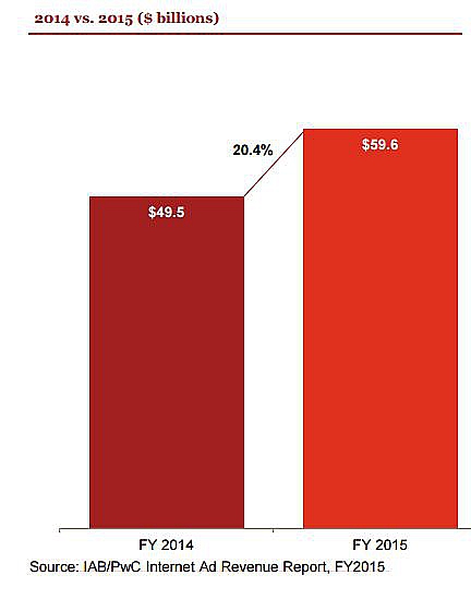 В 2015 году американский рынок интернет-рекламы вырос на 20,4%. Расходы рекламодателей на digital составили 59,6 млрд долларов, следует из отчета PricewaterhouseCoopers и Interactive Advertising Bureau. Стремительный рост мобильной рекламы отражает ее возросшую ценность для маркетологов, сказал глава IAB Рэндалл Ротенберг.