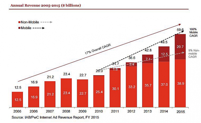 Mobile остается одним из самых быстрорастущих сегментов рекламного рынка. По итогам прошлого года его объем увеличился на 66% и достиг 20,7 млрд долларов. Для сравнения: в 2012 году на мобильную рекламу было потрачено всего 3,4 млрд долларов.