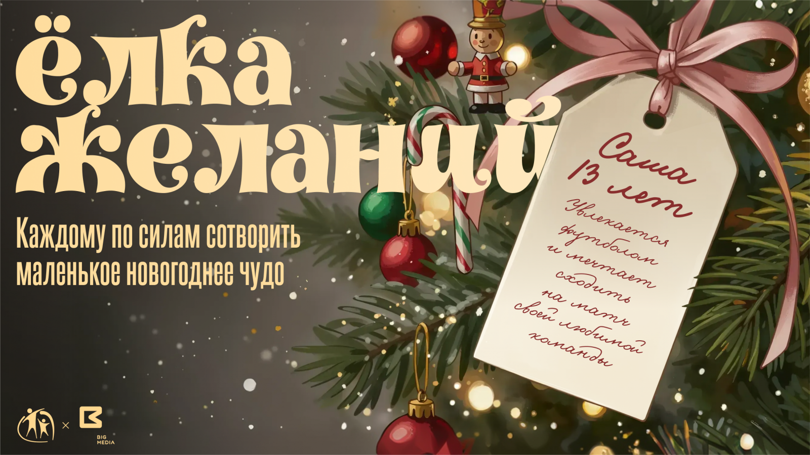 «Наставники детям» вместе с Big Media Moscow запустили благотворительную акцию «Ёлка Желаний». Ребята из детских домов по всей России написали свои заветные желания: кто-то из них занимается футболом и надеется вживую увидеть игру любимой команды, кто-то мечтает сходить в театр в соседнем городе, а кто-то хочет впервые в жизни побывать в аквапарке.