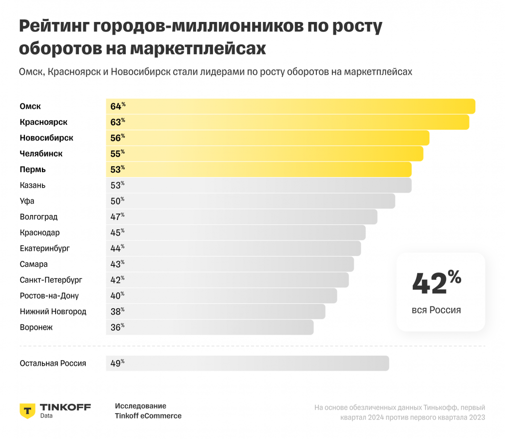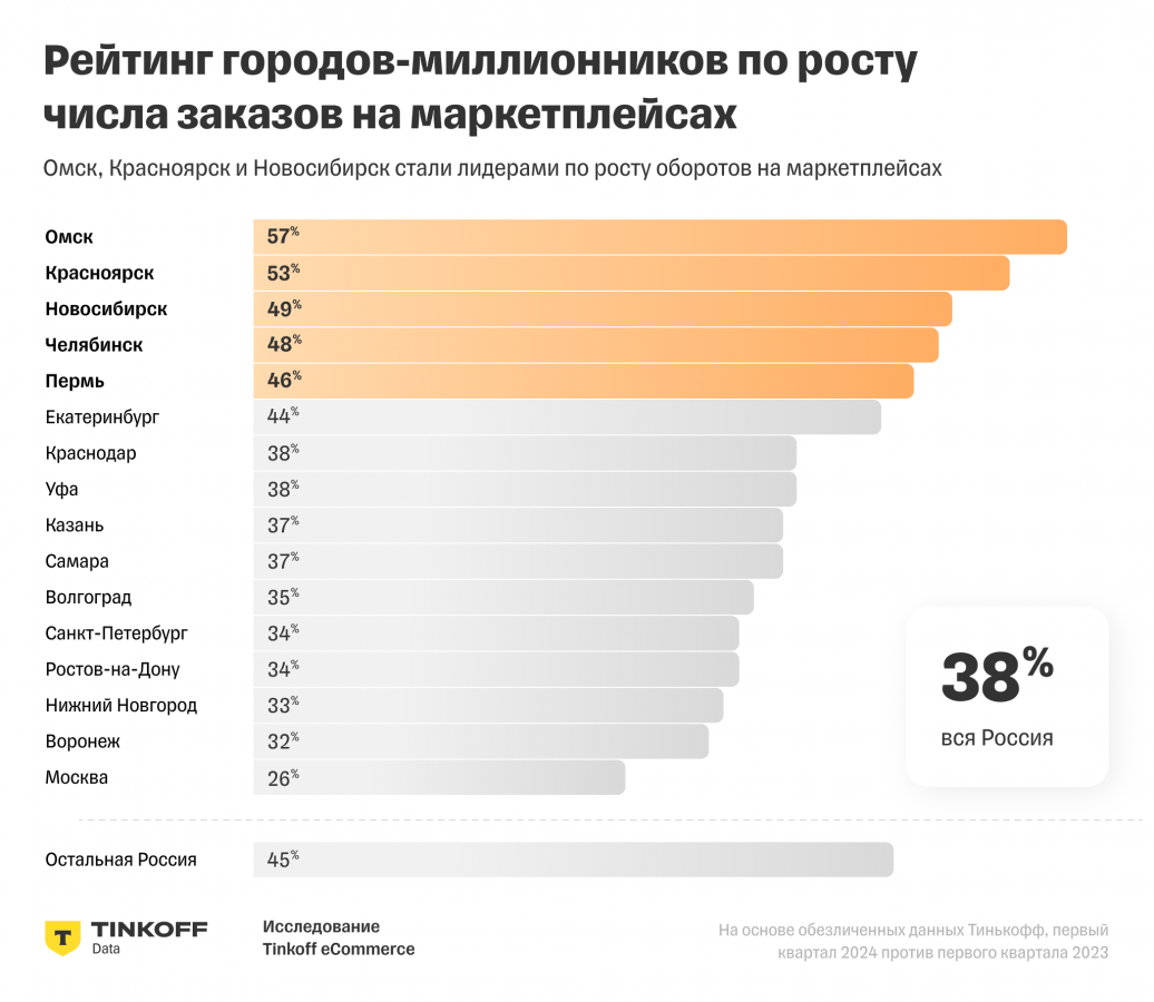 В топ-5 городов-миллионников по росту количества заказов на маркетплейсах вошли Омск (плюс 57%), Красноярск (плюс 53%), Новосибирск (плюс 49%), Челябинск (плюс 48%) и Пермь (плюс 46%). В десятку также попали Екатеринбург (44%), Краснодар и Уфа (по 38%), Казань и Самара (по 37%).