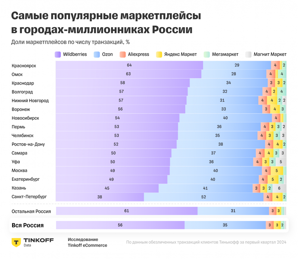 Почти во всех городах больше половины покупок на маркетплейсах совершаются на Wildberries, за исключением Москвы, Екатеринбурга, Казани и Санкт-Петербурга.