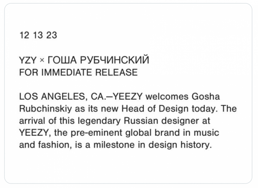 «Yeezy приветствует Гошу Рубчинского в качестве нового руководителя отдела дизайна. Приход этого легендарного российского дизайнера в Yeezy, ведущий мировой бренд в музыке и моде, является важным достижением в истории дизайна», — написал рэпер.