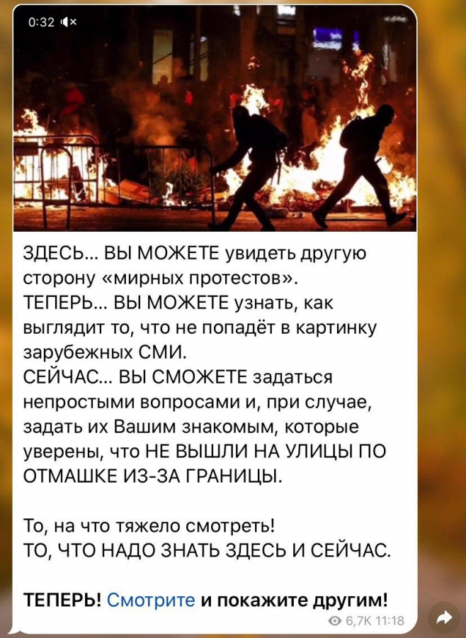 «БелТА» сопровождает пост словами о том, что зритель может «увидеть другую сторону «мирных протестов», узнать, как выглядит то, что не попадёт в картинку зарубежных СМИ, задаться непростыми вопросами и, при случае, задать их вашим знакомым, которые уверены, что не вышли на улицы по отмашке из-за границы». Ссылка на ролик ведет в Telegram-канал «Желтые сливы».