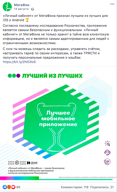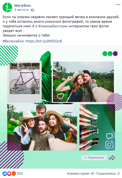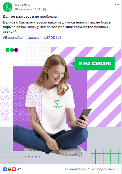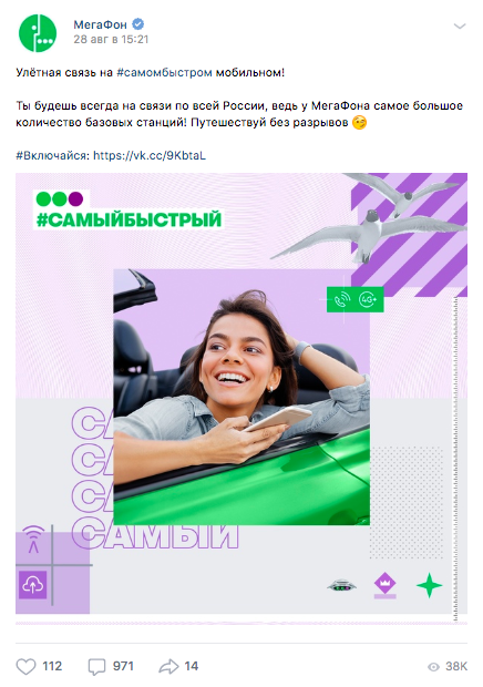 Контент-политика бренда «Мегафон» чрезвычайно показательна. Его места в рейтингах (первое в Instagram и четвертые в FB и ВК), на наш взгляд, отражают эффективность соответствующей тактики. И в Facebook, и во «ВКонтакте» бренд выпускает разные посты, которые эффектно оформлены в фирменных зеленых цветах. В них компания информирует о новинках и возможностях используемой технологии, читай — ее конкурентных преимуществах. Это хороший пример Help-контента. Результаты неплохие, но не великие — четвертое место и в Facebook, и во «ВКонтакте».