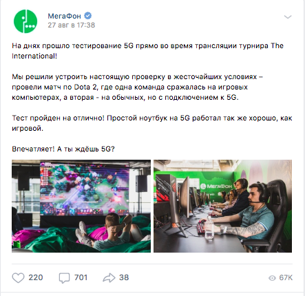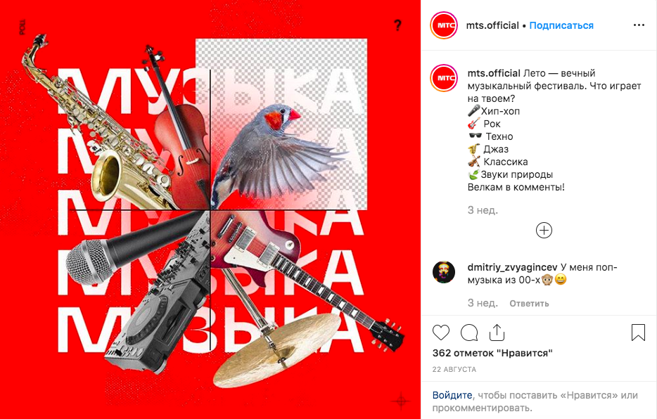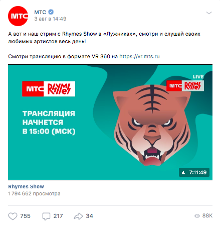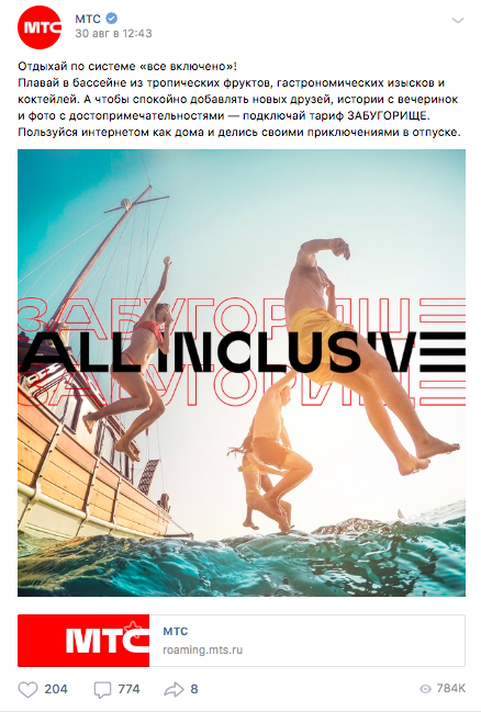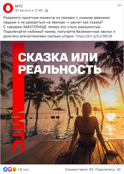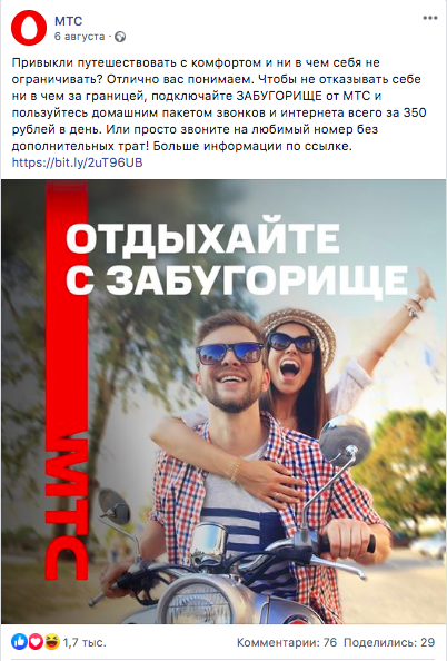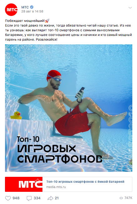 Вместе с тем, посты МТС отличают продуманность и броский дизайн. Для каждой сети был разработан свой фирменный стиль, да и текст, по сути, канонический: короткий и зажигательный. Правда, тематика наиболее успешных с точки зрения количества реакций постов довольно однообразна. В них нет игры с пользователем. Посты предлагают выгодный тариф, возможность скачать музыку, присутствие на стрим-трансляции концертов