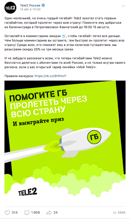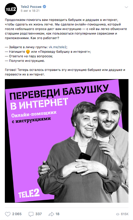 А вот в сети «ВКонтакте» бренд использует другую контент-стратегию. Здесь посты основаны на идее собственной рекламной кампании со слоганом «Переведи бабушку в интернет». В общем, и тут ничего нового: описание нового онлайн-помощника, путеводитель по мобильному интернету, конкурс с вовлечением пользователей. Но! Когда все это погружено в более общий культурный контекст, многое меняется.