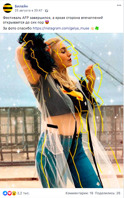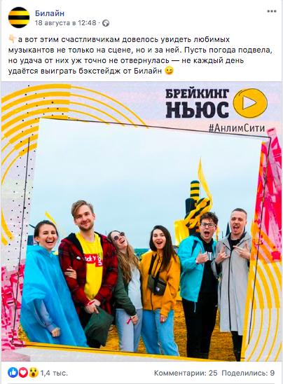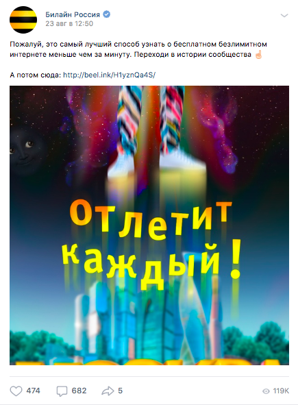 Бренд «Билайн», наверное, стал бы победителем в многоборье, если бы такой подсчет проводился. На его счету одно «золото» и два «серебра». При этом, черно-желтые позволяют себе повторять одни и те же посты в разных сетях — и ничего, заходят. Зато содержание постов отличается разнообразием: не только новые продукты и предложения, но и конкурсы, фестивали, акции, бэкстейджи. Заметно желание бренда вовлечь аудиторию в общение, «активировать» ее.