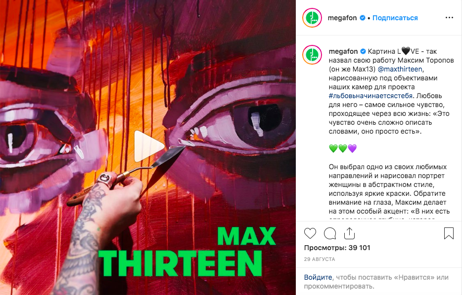 Здесь «Мегафон» в своих постах рассказывает об искусстве, демонстрируя в небольших видео «рабочий процесс» рождения произведений и рассказывая об их создателях. Результат активного использования Hero-контента — первое место в этой социальной сети.