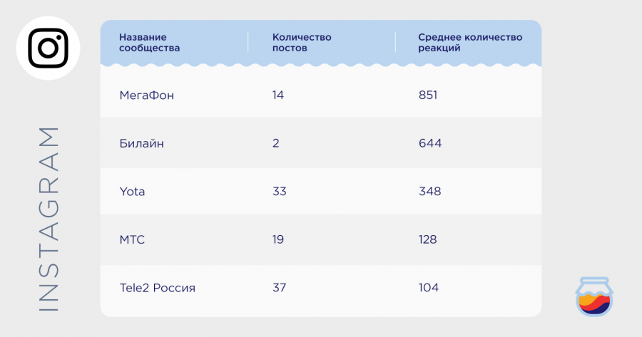 Еще один пример того, как одна и та же компания может в одной сети («ВКонтакте») занимать первое место в рейтинге, а в другой (Instagram) — пятое, т.е. последнее из анализируемого списка. И снова все дело в типе контента.